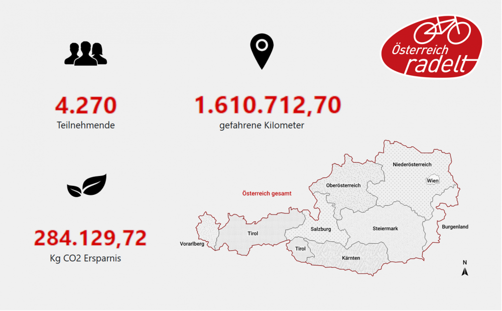 Sechs Bundesländer radelten auch heuer wieder durch die Wintersaison. Die Hälfte der 1,6 Millionen Kilometer steuerte das westlichste Bundesland bei - Vorarlberg liegt in der Winterradel-Wertung 2022 mit 853.000 km vorne. Niederösterreich landet auf dem zweiten Platz mit 276.000 km. Oberösterreich kam auf 161.000 km, knapp gefolgt von Salzburg mit 155.000 km. Wien erradelte 125.000 km und das Burgenland 59.000 km.
